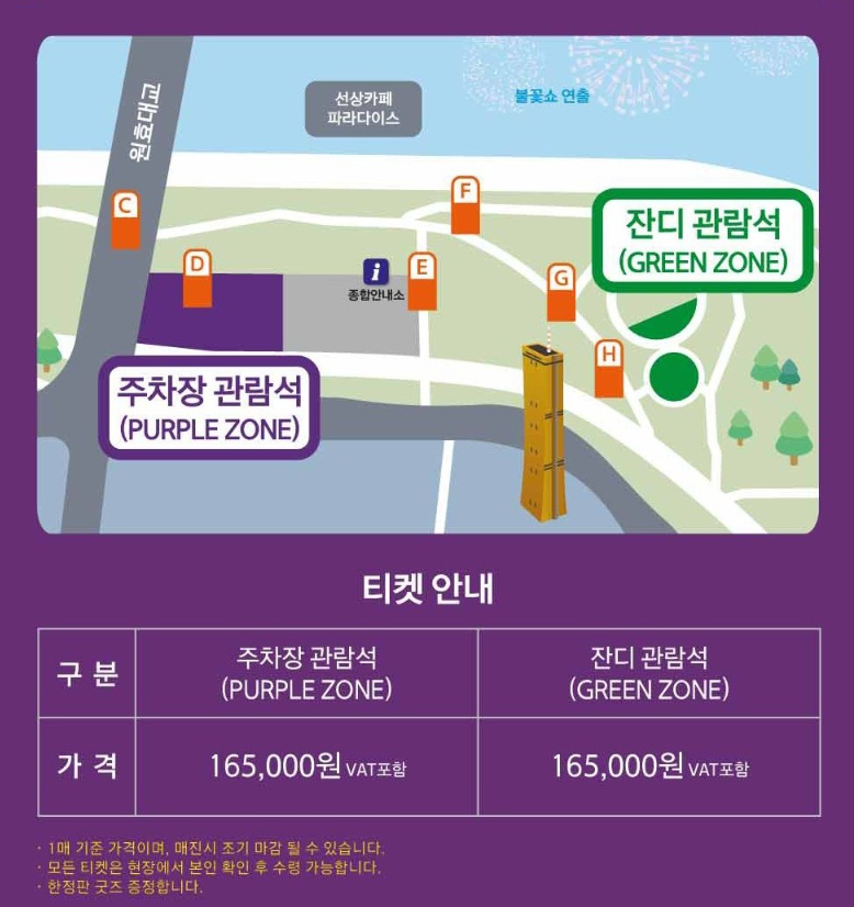 골든티켓 좌석은 불꽃이 터지는 바지선과 무대가 정면으로 보이는 명당 중에 명당 입니다.