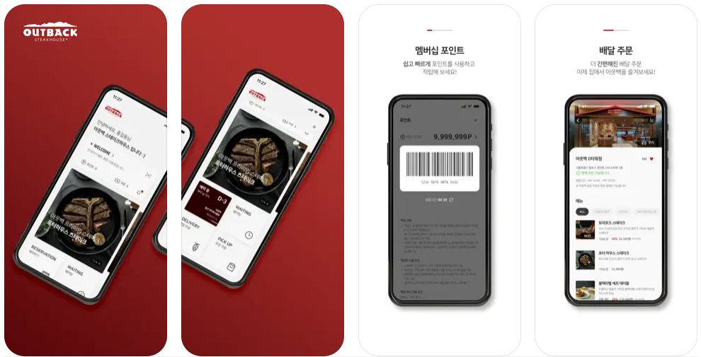프리미엄 다이닝 아웃백 스테이크하우스의 다양한 메뉴와 매장 예약/웨이팅 기능부터 배달/포장 주문 서비스, 이벤트, 아웃백 멤버십 혜택을 확인해보세요.