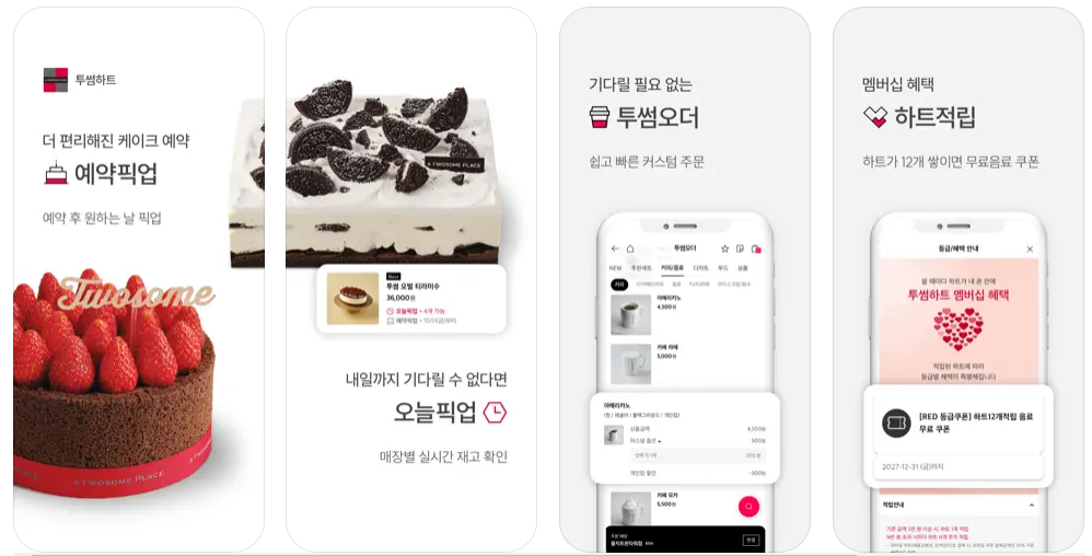쉽고 빠르게 주문하는 모바일 주문 서비스 '투썸오더', 혜택이 하트로 차곡차곡 쌓이는 '신규 멤버십'과 '스탬프' 적립, 다양한 종류의 투썸 케이크를 미리 주문할 수 있는 '예약픽업'과 '오늘픽업'까지! 더 편리하고 새로워진 투썸하트 앱을 만나보세요.